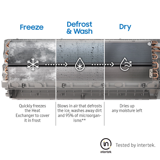 În plus, toate unitățile interne WindFree™ lansate în 2025 includ funcția Freeze Wash, un proces automat de curățare în trei etape (înghețare, dezghețare și uscare). Schimbătorul de căldură este înghețat până la -15°C, iar prin topirea gheții sunt eliminate impuritățile acumulate, ceeace ce facilitează întreținerea aparatului fără intervenții complexe de service.